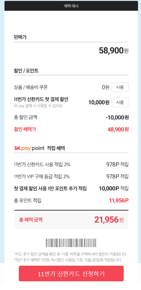 11번가에서 SK pay 결제 시 이용금액의 1% 적립 11번가에서 SK pay로 결제한 금액의 1%를 SK pay 포인트로 적립해 드립니다.