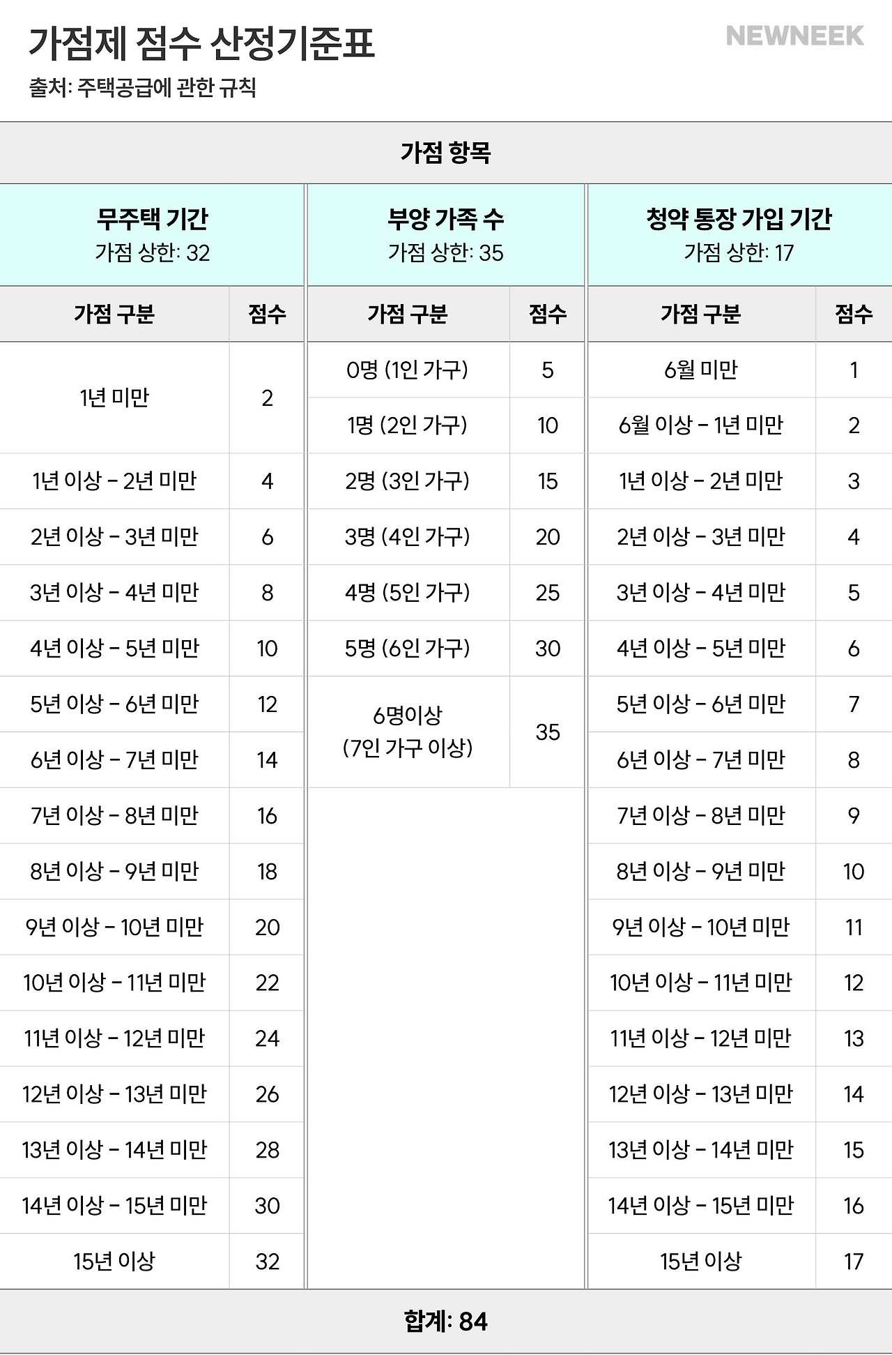 이렇게 계산된 점수는 총 84점까지 가능해요. 따라서, 가점을 높이기 위해서는 무주택 상태를 유지하고, 가족을 부양하며, 청약 통장 가입 기간을 늘리는 것이 중요해요.